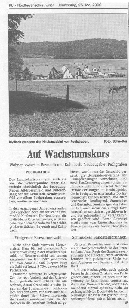Hallo liebe Besucher ! Waren Sie schon mal im Paradies ? Sie meinen das gibt`s erst später ? Dann waren Sie noch nicht in Pechgraben, einen Ort zur Gemeinde Neudrossenfeld gehörend ! Viele Neubürger haben hier eine überaus freundliche Aufnahme in eine völlig intakte Dorfgemeinschaft gefunden, für die sie den "Ureinwohnern" unendlich dankbar sind ! Neben den vielen persönlichen Kontakten gibt es auch immer wieder kulturelle Highlights, z.B. ist seit geraumer Zeit Cordelia Mertel, die weit über Neudrossenfeld hinaus bekannte Designerin in Pechgraben tätig. Einen kleinen Eindruck ihrer Arbeiten erleben Sie hier: Auch wenn`s um alle professionellen Fragen rund um Grafik, Werbung und Design geht gibt`s in Pechgraben den Spezialisten ! Der schnellste Zeichner westwärts von Bayreuth... Leider gibt es auch negative Schlagzeilen ! Direkt im Anschluss an das Baugebiet entsteht jetzt erneut, nach bereits über 30 Jahren Sandabbau in Pechgraben eine riesige neue Sandabbaufläche ! Sowohl der Gemeinderat von Harsdorf, als auch von Neudrossenfeld haben bereits ihr Veto zum Ausdruck gebracht. Alle Anwohner, die das wunderschöne, naturbelassene Naherholungsgebiet schätzen, sind empört, zumal bei momentaner Stagnation in der Bauwirtschaft, die bereits vorhandenen Gruben kaum genutzt werden. Gibt es Hilfe ? Wir wünschen uns nichts sehnlicher ! Am 16.07.2005 brachte dazu die Bayerische Rundschau unter der Rubrik "das Thema der Woche" eine ganze Seite an wichtigen Informationen.